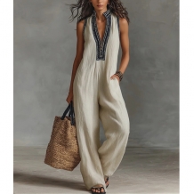 Damjumpsuit med djup V-ringning, boho-stil, ärmlös, vida ben och praktiska fickor