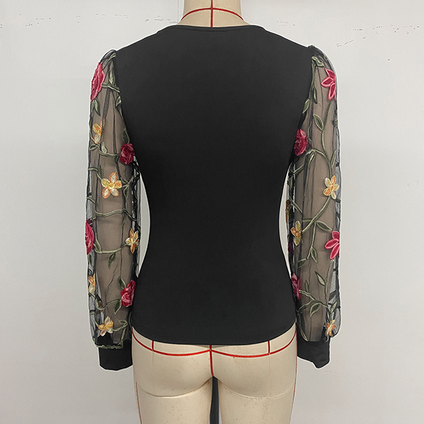 Denna skjorta med blombroderi är ett vackert och elegant plagg som kombinerar fina detaljer med en feminin silhuett. Det skarvade tyget längs ärmen ger skjortan en lätt och luftig känsla, vilket skapar en mjuk och böljande look. Medan blombroderidetaljerna ger ett romantiskt och fantasifullt element till den övergripande designen, vilket skapar en charmig och iögonfallande look. Du kan kombinera skjortan med skräddarsydda byxor eller en kjol för en elegant och sofistikerad look, eller bära den med jeans och platta skor för en mer avslappnad och avslappnad look.