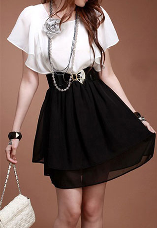 The dress in black and white is cut from lightweight chiffon fabric and features short butterfly sleeves,a simple round neck and a tiered skirt.Finish off the look with a pair of high heel sandal.
