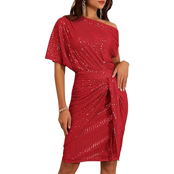 Denna glamorösa och iögonfallande klänning är prydd med bländande paljetter som glittrar och glänser, vilket gör den idealisk för alla speciella tillfällen. Den sneda axeldesignen tillför en trendig och modern touch, och den självknutna detaljen framtill skapar en smickrande och elegant siluett. Perfekt för festkläder!