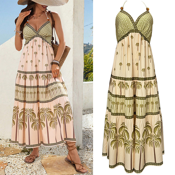 Bohemisk stil blomtryckt halterneck ärmlös midiklänning