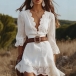 Bohemisk vit spetsklänning med V-ringning och armbågslånga ärmar