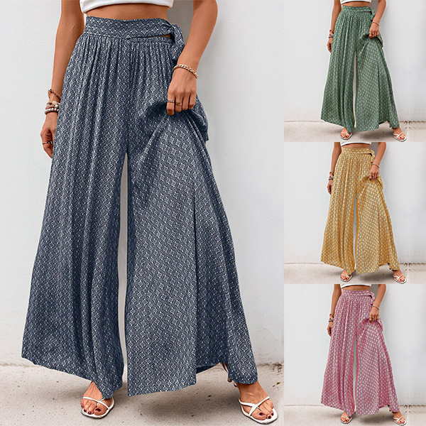 Bohemisk Stil Mönstrade Högmidjade Vida Byxor med Självknuten Midja