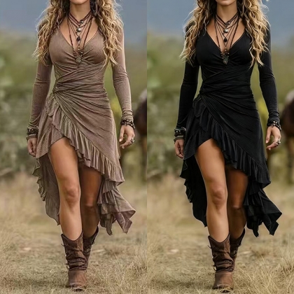 Denna bohemiska, chica klänning har en romantisk V‑ringning och förtrollande bohemisk inspiration. Den böljande, rynkade konstruktionen ger modern, frisinnad elegans. Den oregelbundna volangkanten i fållen skapar dynamisk rörelse och en fantasifull charm som framhäver den vackra balansen mellan V‑ringningens smickrande förfining och bohemisk, konstnärlig elegans. Vill du prova?