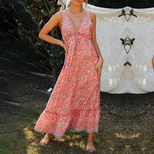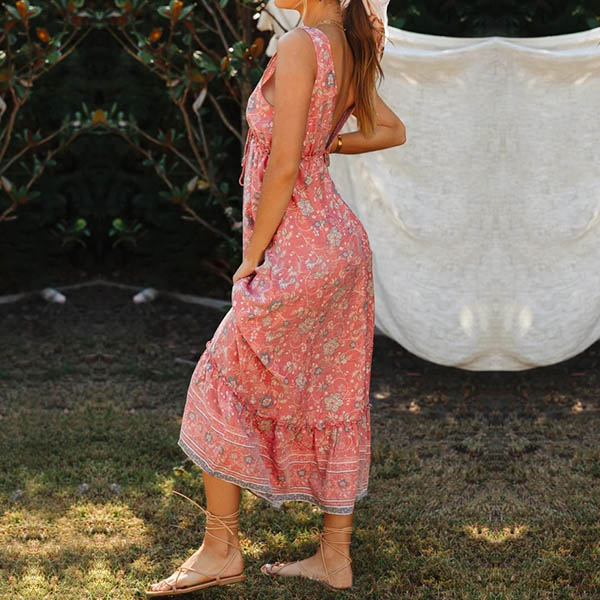 Bohemian Style Backless V-neck Sleeveless Printed Maxi Dress