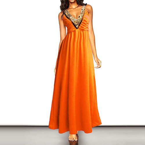a deep v-neck,and its neckline decorated with beaded,sexy and charming. Walking