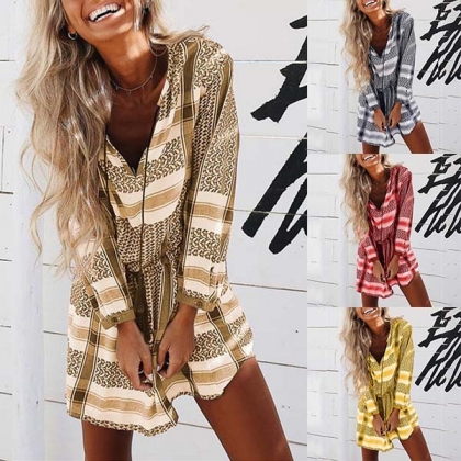 Features chic printed details,with long sleeve and v-neck design,this dress can make any girl