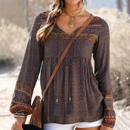 tryckta detaljer, med lång ärm och v-ringad design, tofsdesignen vid halsringningen kommer