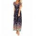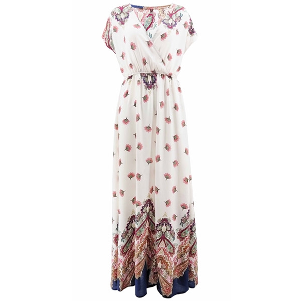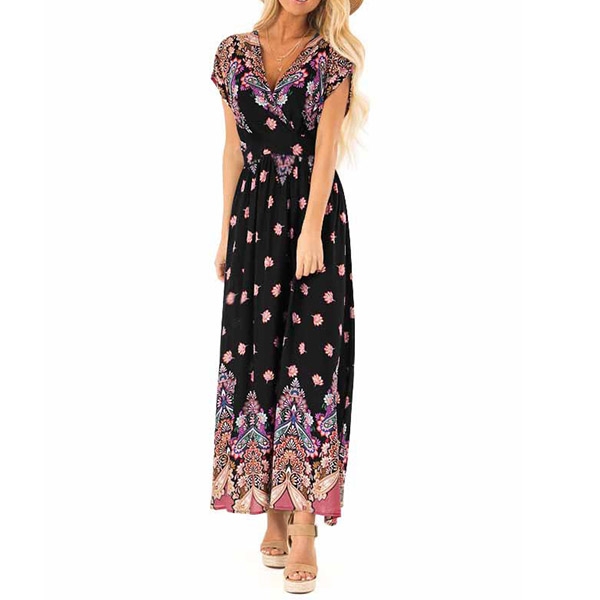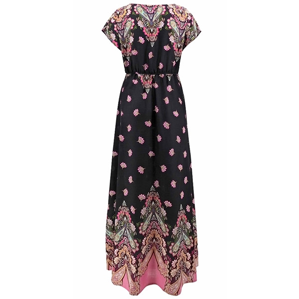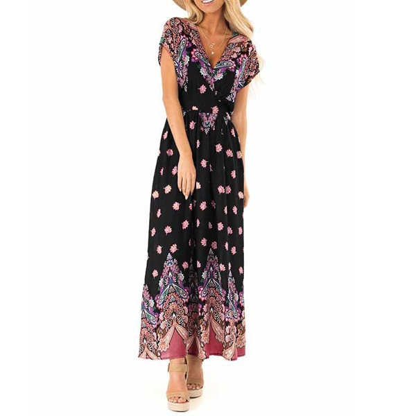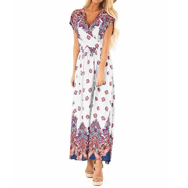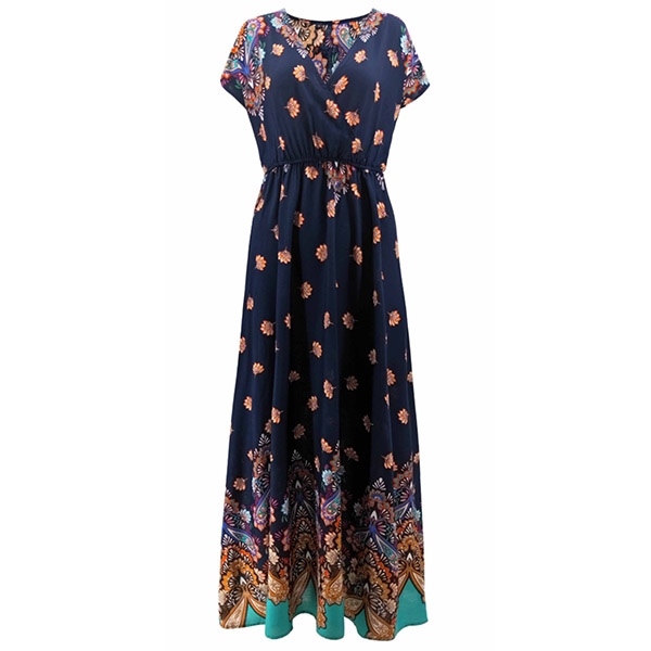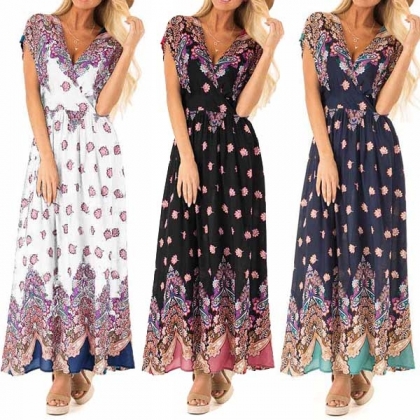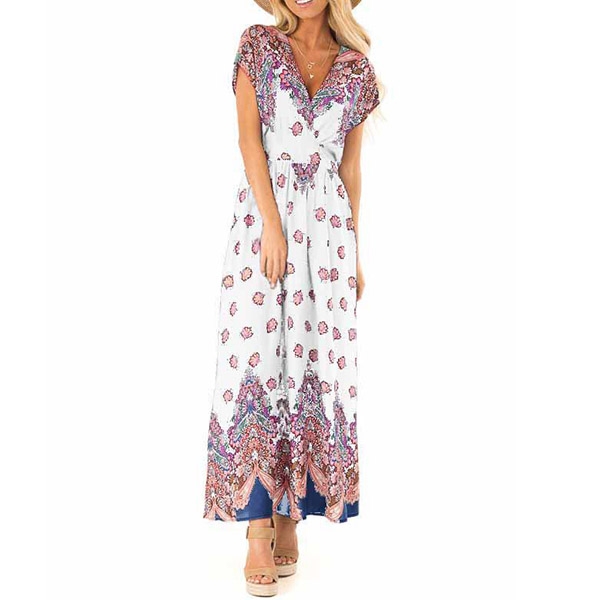 Bohemian Style Short Sleeve V-neck High Waist Printed Dress