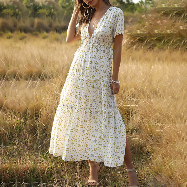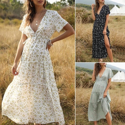 If you are looking for a bohemian-themed dress for your beach days and tropical getaways,then look no further than this piece! Its boasts vibrant floral print details,with short sleeve,v-neck,slit hem and high waist design,this dress makes it easy for any girl to look effortlessly charming and beautiful.