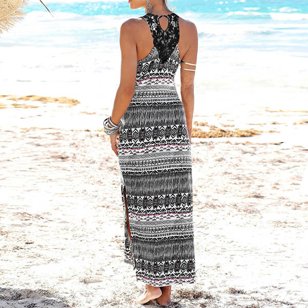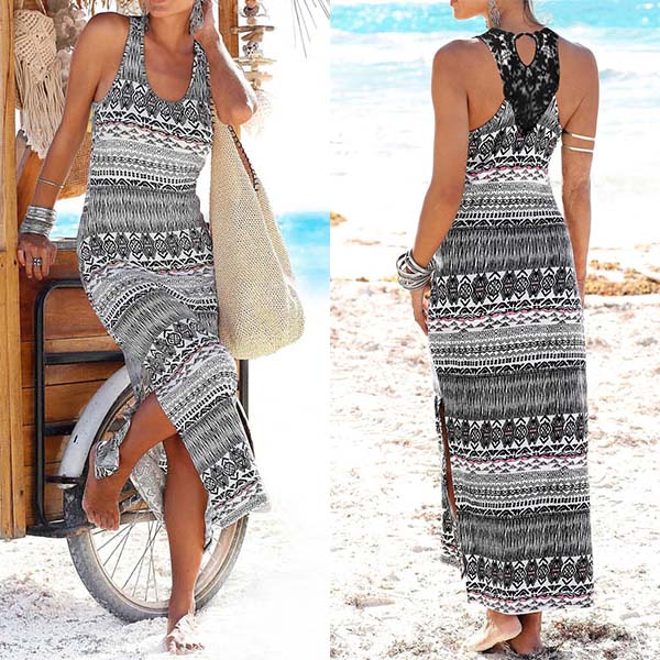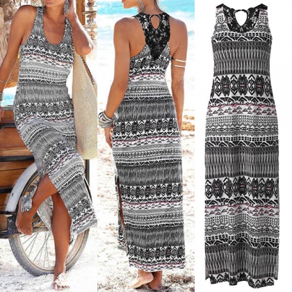 Looking for a relaxed dress for your beach days and tropical getaways? Then we suggest you this piece. It features chic printed details,with sleeveless,round neck,slit hem and a maxi length,this dress definitely can showcase your beauty and femininity. On these sunny days,adding a sweet straw hat would make you look more perfect!