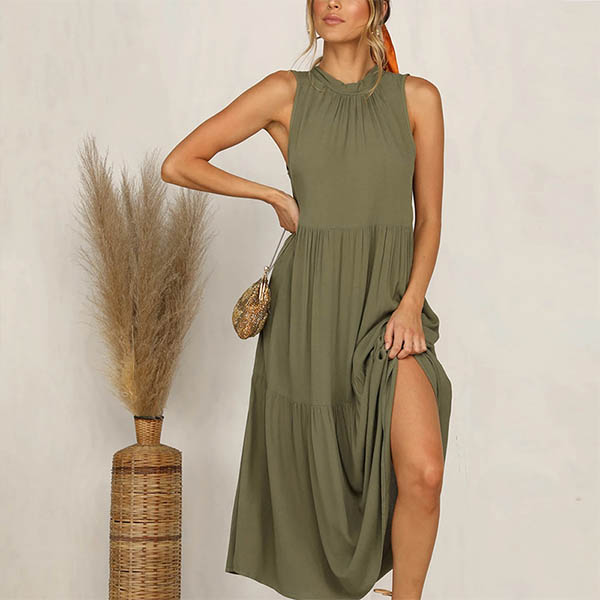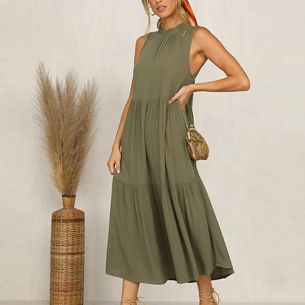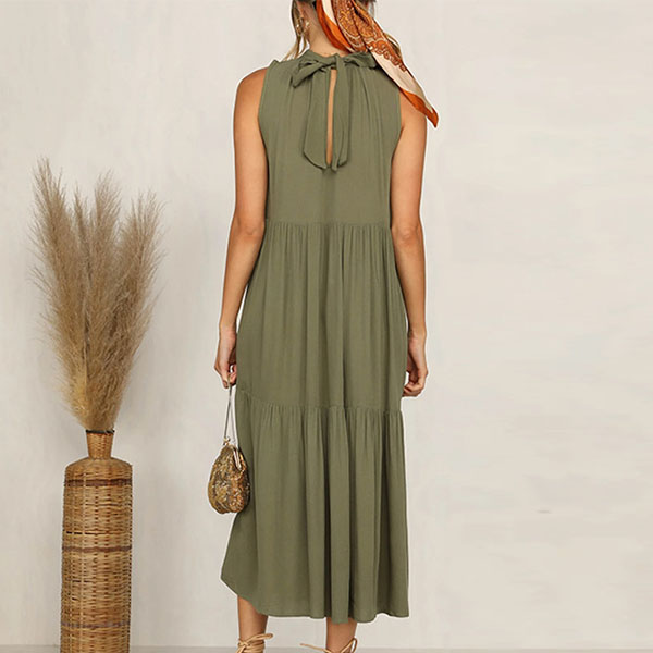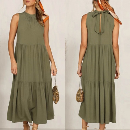 Bohemian Style Sleeveless Round Neck Solid Color Dress