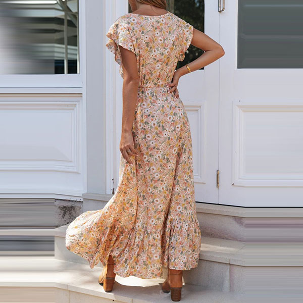 Bohemian Style V-neck Irregular Ruffle Hem Printed Dress