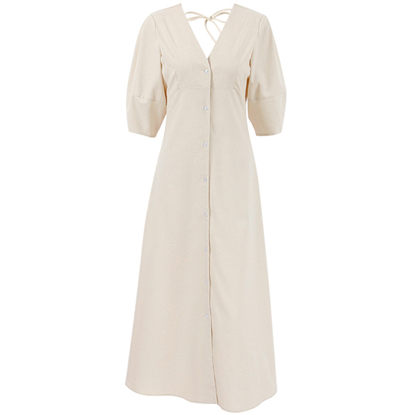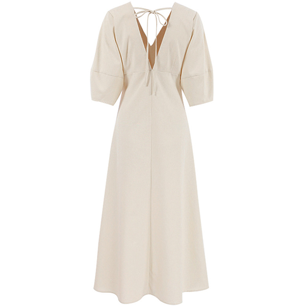 Avslappnad och bekväm klänning med V-ringning och armbågslängd i bomull och linne