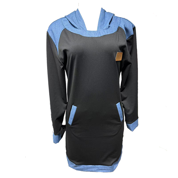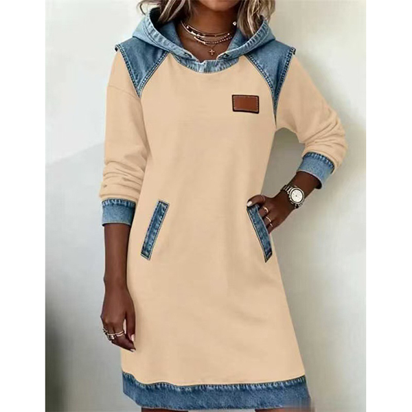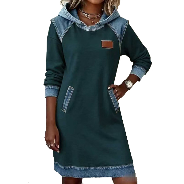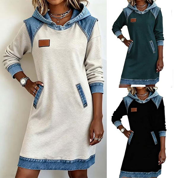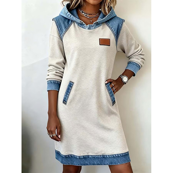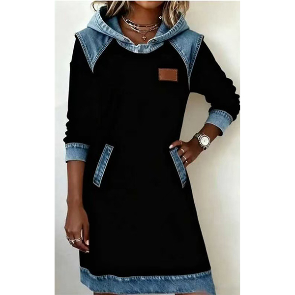 Denna avslappnade klänning har en modern kontrastfärgad design, bekväm huva och långärmad modell som ger en modern, avslappnad sofistikering. Perfekt för vardagsbruk.