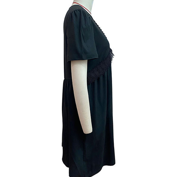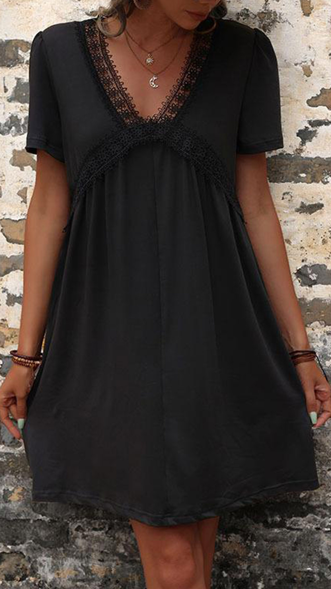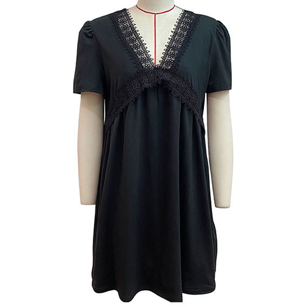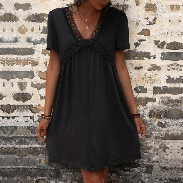 How about this casual dress? It features a delicate lace spliced design along the V-neck that adds a touch of elegance and allure. While the mini length adds a touch of playfulness and fun.
