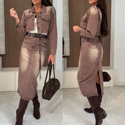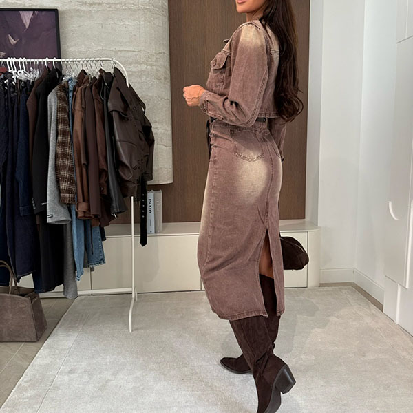 Avslappnat denimset med lös jeansjacka och knälång kjol