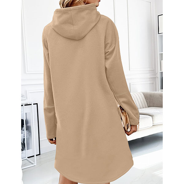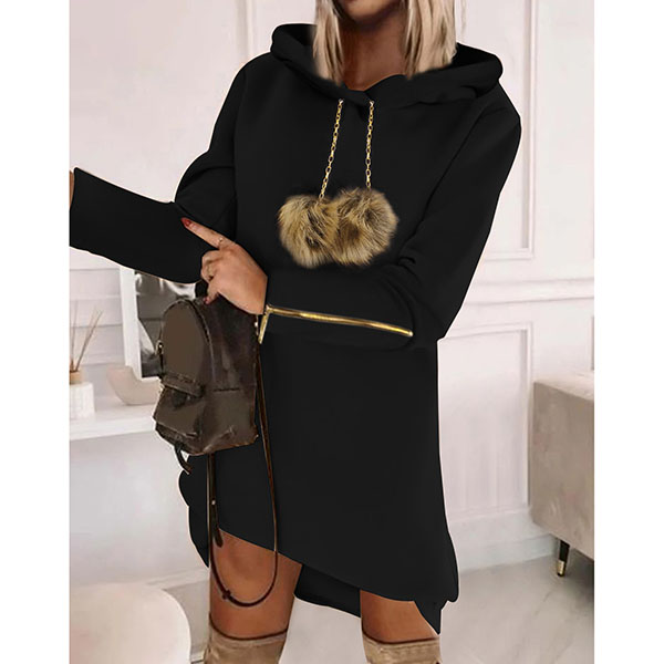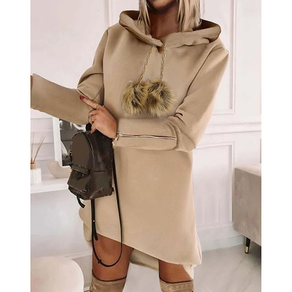 Håll dig mysig och snygg i denna klänning. Den lekfulla pom-pom-kedjedetaljen och den bekväma huvan gör den idealisk för avslappnade dagar. Långärmarna ger extra värme, medan dragkedjan vid manschetten tillför en modern touch. Perfekt både för en ledig utflykt och för att koppla av hemma.