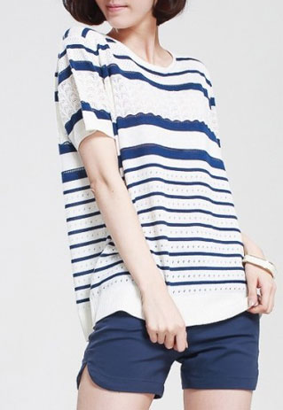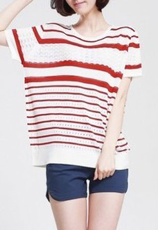 The tee is cut from soft fabric and features contrasting stripes and all-over small cutout details,a round neck,short sleeves and a loose fit.Team it with shorts and sneakers for a casual look.