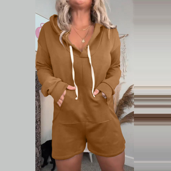 Casual Enfärgad Huvtröja med Dragsko och Långa Ärm Känguruficka Jumpsuit