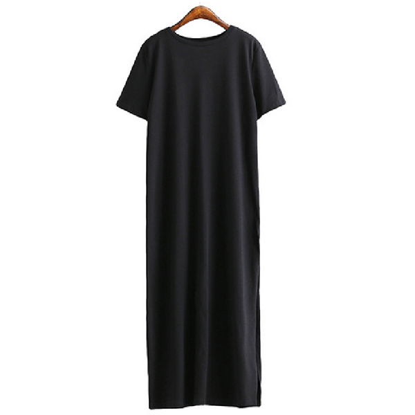This casual yet chic dress features a solid color design and a comfortable round neck. The short sleeves provide coverage while keeping you cool, and the side slits add a touch of elegance and movement to the dress. Perfect for a day out running errands or a casual lunch with friends, this dress is versatile and easy to style.