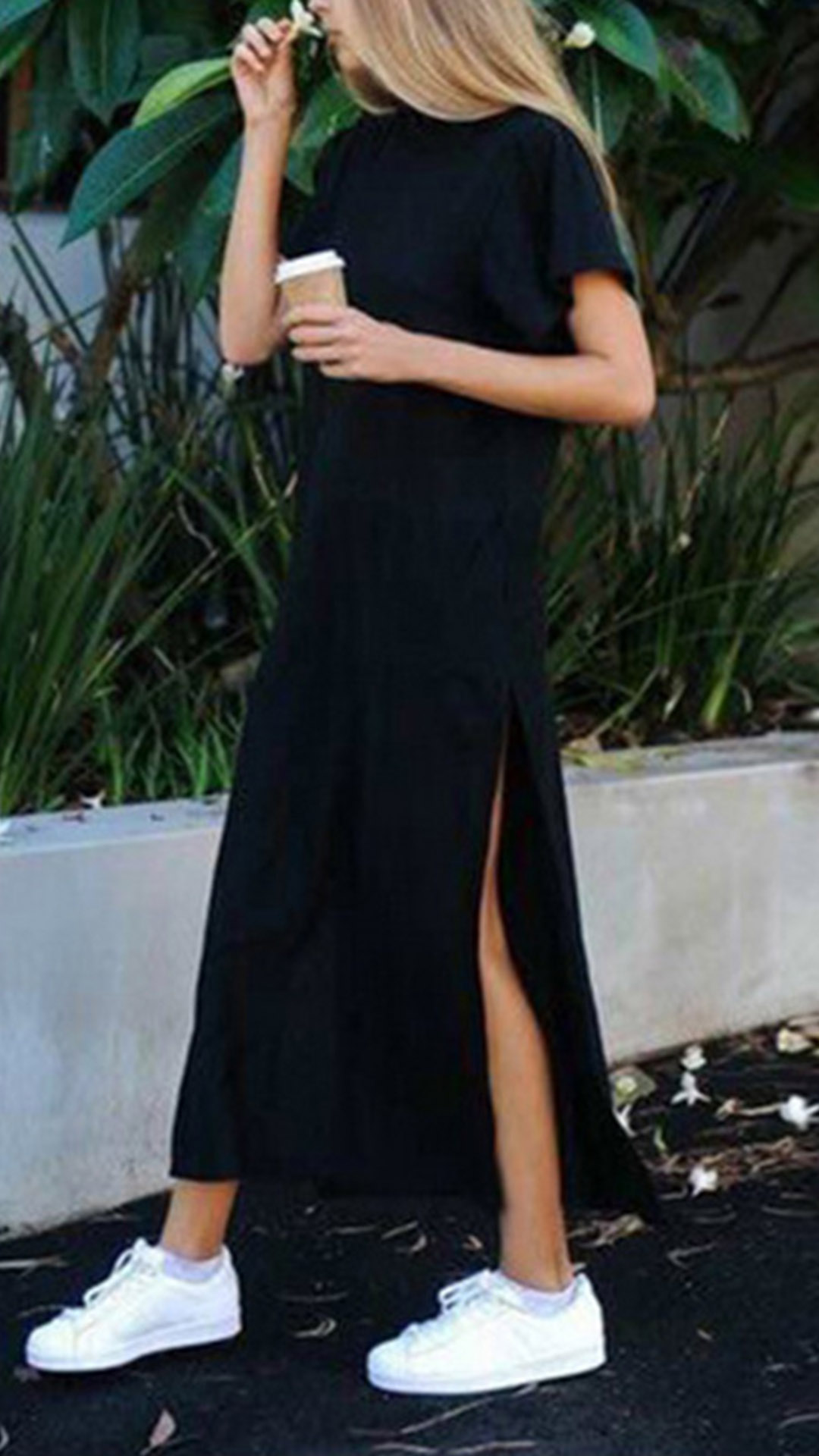 Casual Solid Color Round Neck Short Sleeve Side Slit Dress