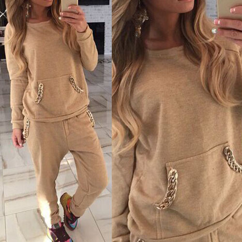 During your sports time or your weekend time,this sports suit is your best choice. Crafted from soft and breathable fabric,which can keep you comfy all day. And its pockets decorated with chain makes it look more chic and unique. Multi colors for your optional.