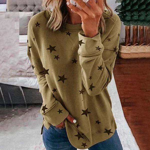 For a casual,relaxed yet stylish style,this sweatshirt knows how to achieve for that. It is crafted from soft and breathable fabric,with long sleeve,round neck and a loose silhouette,this piece can offer a long-lasting comfort,while the star printed details will make this piece more attractive. A perfect addition for your casual wardrobe ensemble.