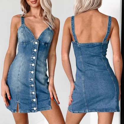 Denna denimklänning har en V-ringning och knappstängning fram. Sidoslitsarna ger rörelsefrihet, och den rygglösa designen tillför en touch av lockelse. Med en gammal tvättad denimfinish erbjuder den en avslappnad och vintageinspirerad look. Detta är ett trendigt och mångsidigt plagg som kombinerar avslappnad stil med moderna detaljer.