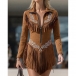 Westerninspirerad miniklänning med avslappnad passform, halv dragkedja i V-ringning, blommönstrad brodyr och tofsar