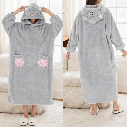 Kattbroderad sammetpläd med långa ärmar och vertikal ficka – perfekt TV-filt