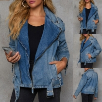 Modernt Ståkrage Kortärmad Självknytande Vida Bensflik Gammeltvättad Denim Overall