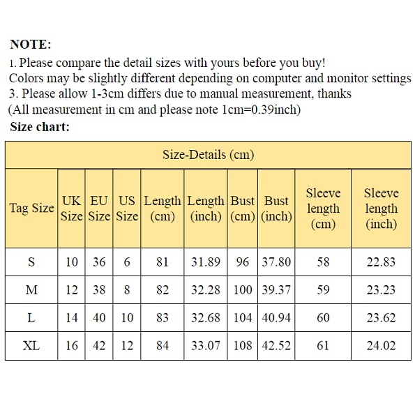 S : Bust : 96cm(37.8"); Sleeve : 58cm(22.83"); Length : 81cm(31.89");
