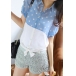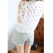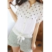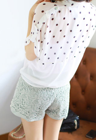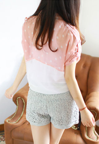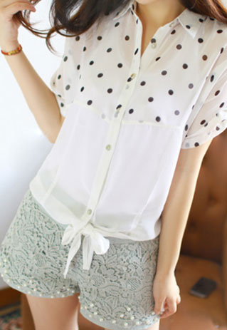 The button-down shirt is cut from semi-sheer chiffon fabric and features polka dots print,short sleeves,a bowknot at the hem.Team it with denim cutoffs and sandals for a stylish summer look.