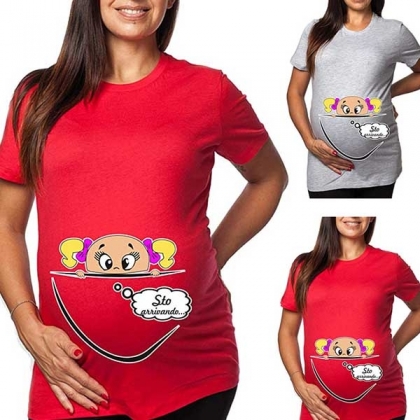 round neck design,this simple,casual yet stylish t-shirt is a good choice for these pregnant women.