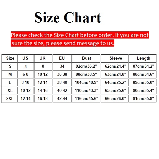 XL : Bust : 110cm(43.31"); Sleeve : 65cm(25.59"); Length : 90cm(35.43");