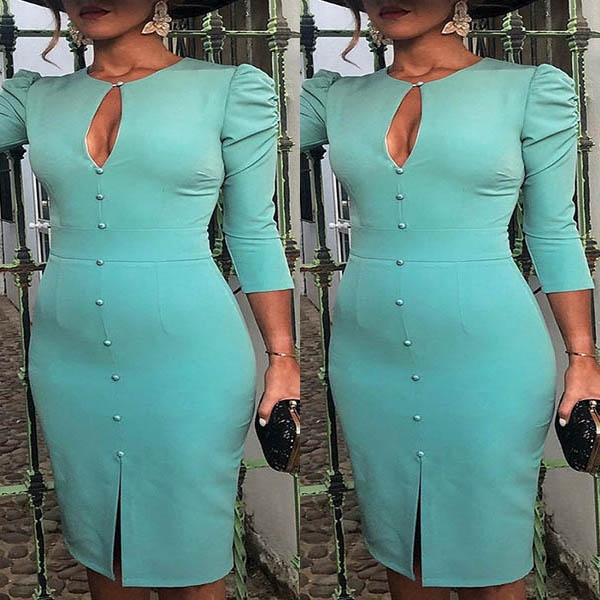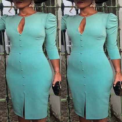 a solid color,finished with 3/4 sleeve,round neck and a fit silhouette,this dress of course knows how to
