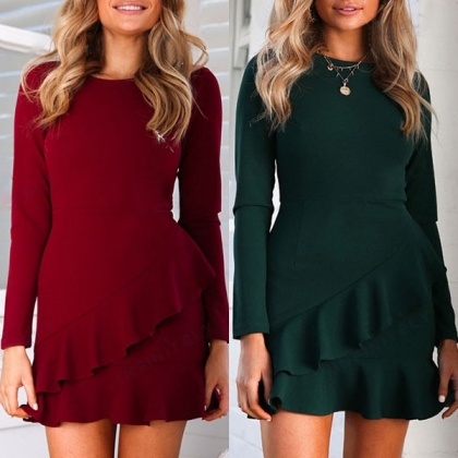delicate dress. It boasts a solid color,with long sleeve,round neck,ruffle hem and a fit silhouette design,