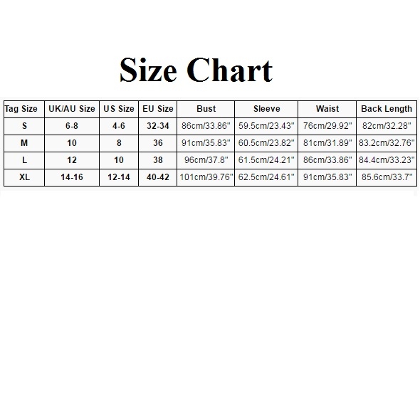 XL : Bust : 101cm(39.76"); Waist : 91cm(35.83"); Sleeve : 62.5cm(24.61"); Length : 85.6cm(33.7");