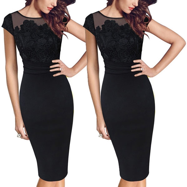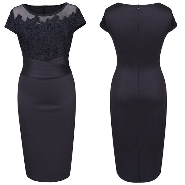 This dress is designed with a mysterious yet flattering black tone,accompanied with short sleeve,round neck,