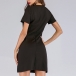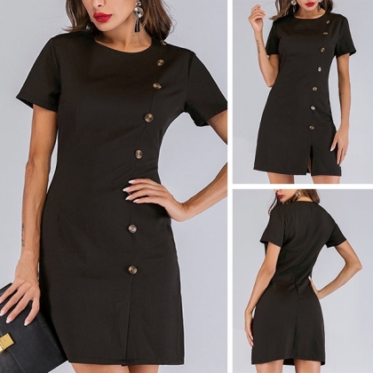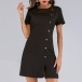 flattering black tone,with short sleeve,round neck and single-breasted design,this is a dress which