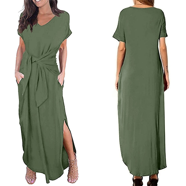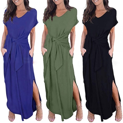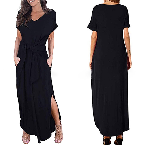 Solid color style,finished with short sleeve,v-neck and slit hem design,stylish yet feminine.