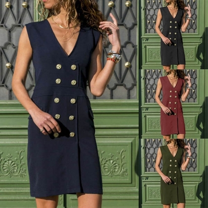 It is finished with sleeveless,v-neck and double-breasted design,chic yet feminine. This is a dress