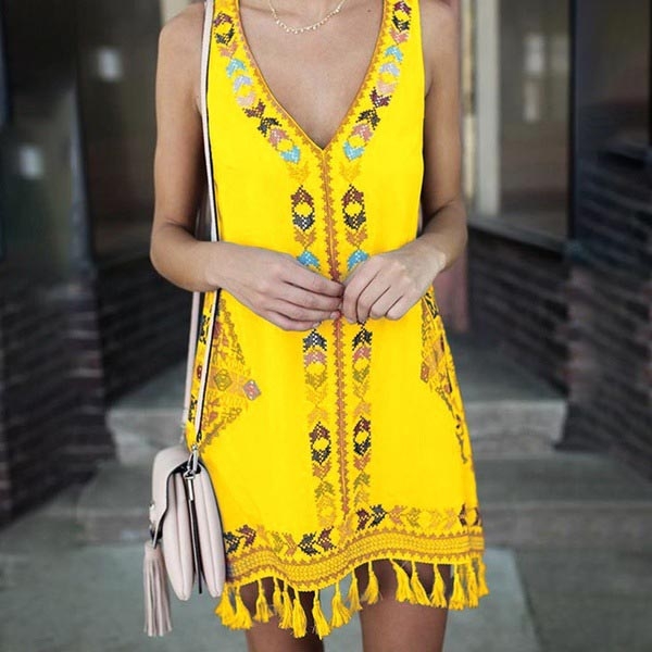 Ethnic Style Sleeveless V-neck Tassel Hem Embroidery Dress