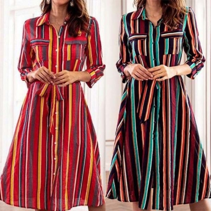 Give your style an instant boost with this shirt dress. The colorful striped design makes this piece look