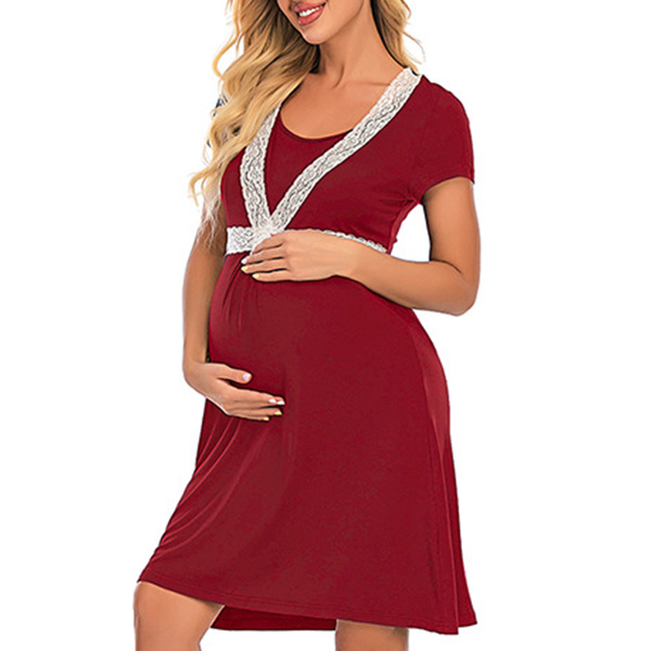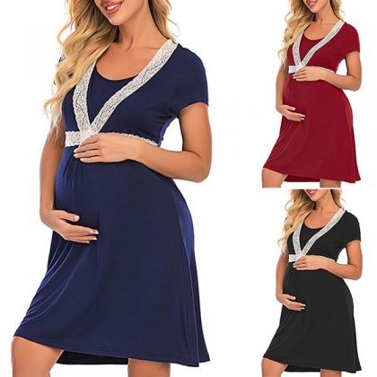 Fashion 3/4 Sleeve V-neck Lace Spliced Maternity Dress