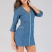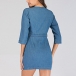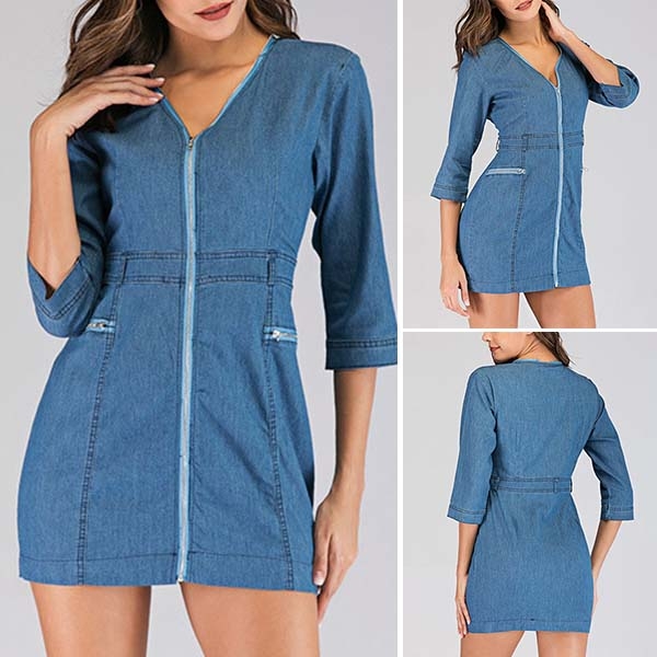 Upgrade your style with this denim dress. It is finished with 3/4 sleeve,v-neck and a fit silhouette,
