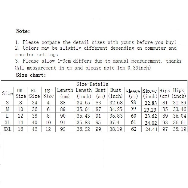 S : Bust : 83cm(32.68"); Hips : 81cm(31.89"); Sleeve : 58cm(22.83"); Length : 88cm(34.65");