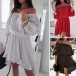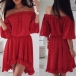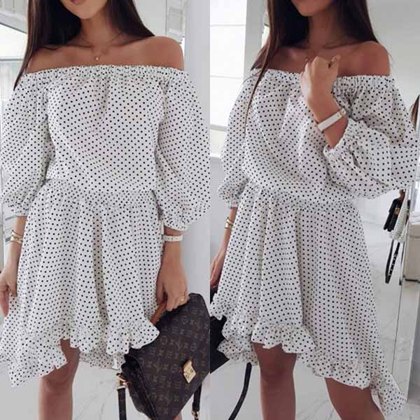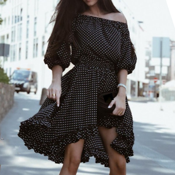 The chiffon dress is soft and slippy,it designed with boat-neck,puff sleeve and irregular hemline.