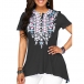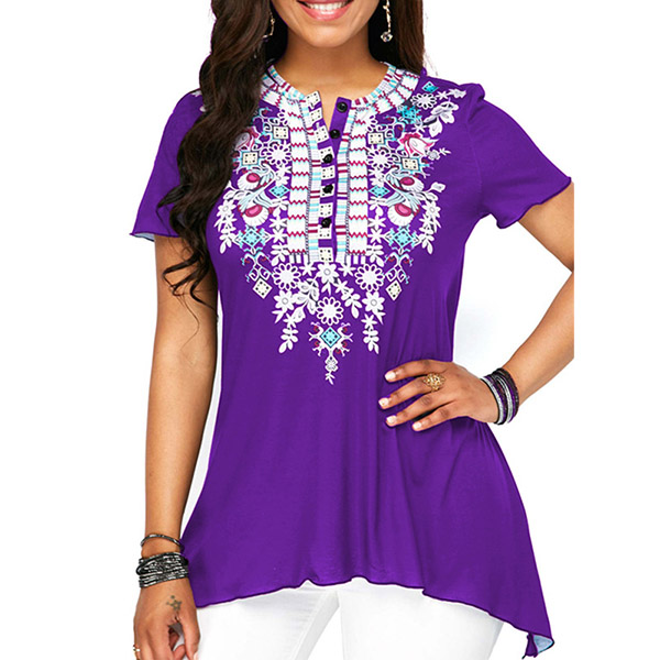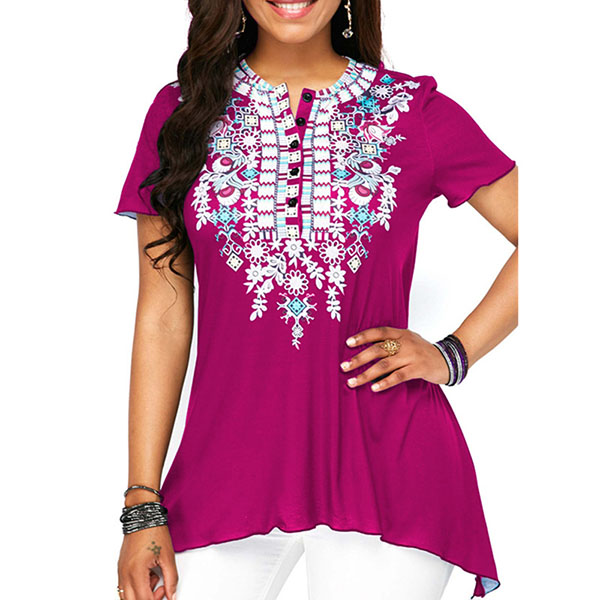 Floral grace this easy-going short sleeve T-shirt with button-front design! This short sleeve T-shirt features